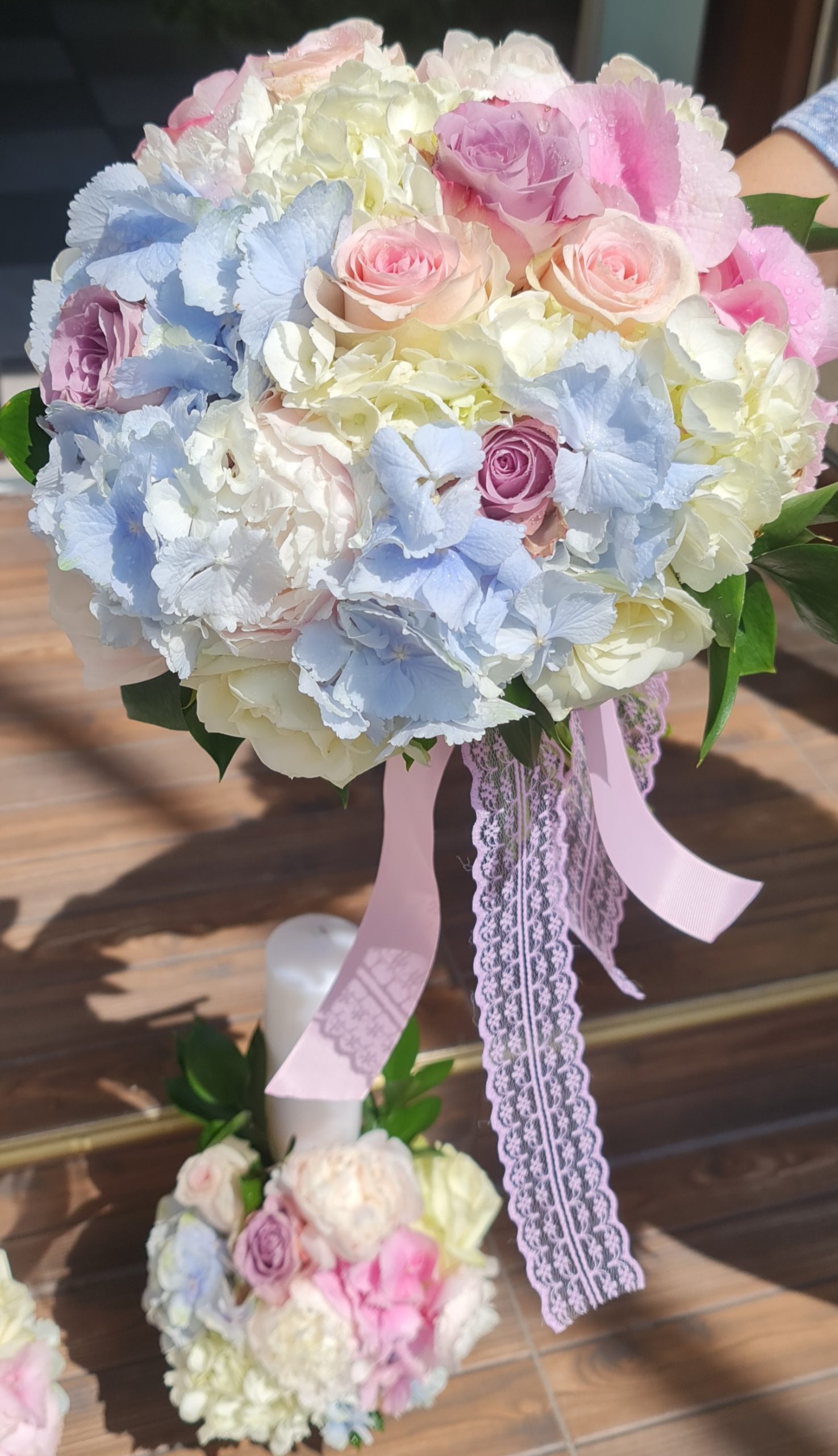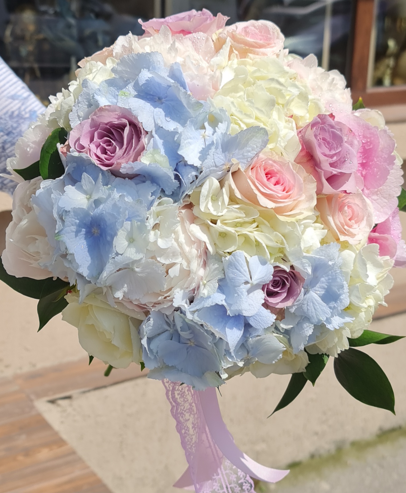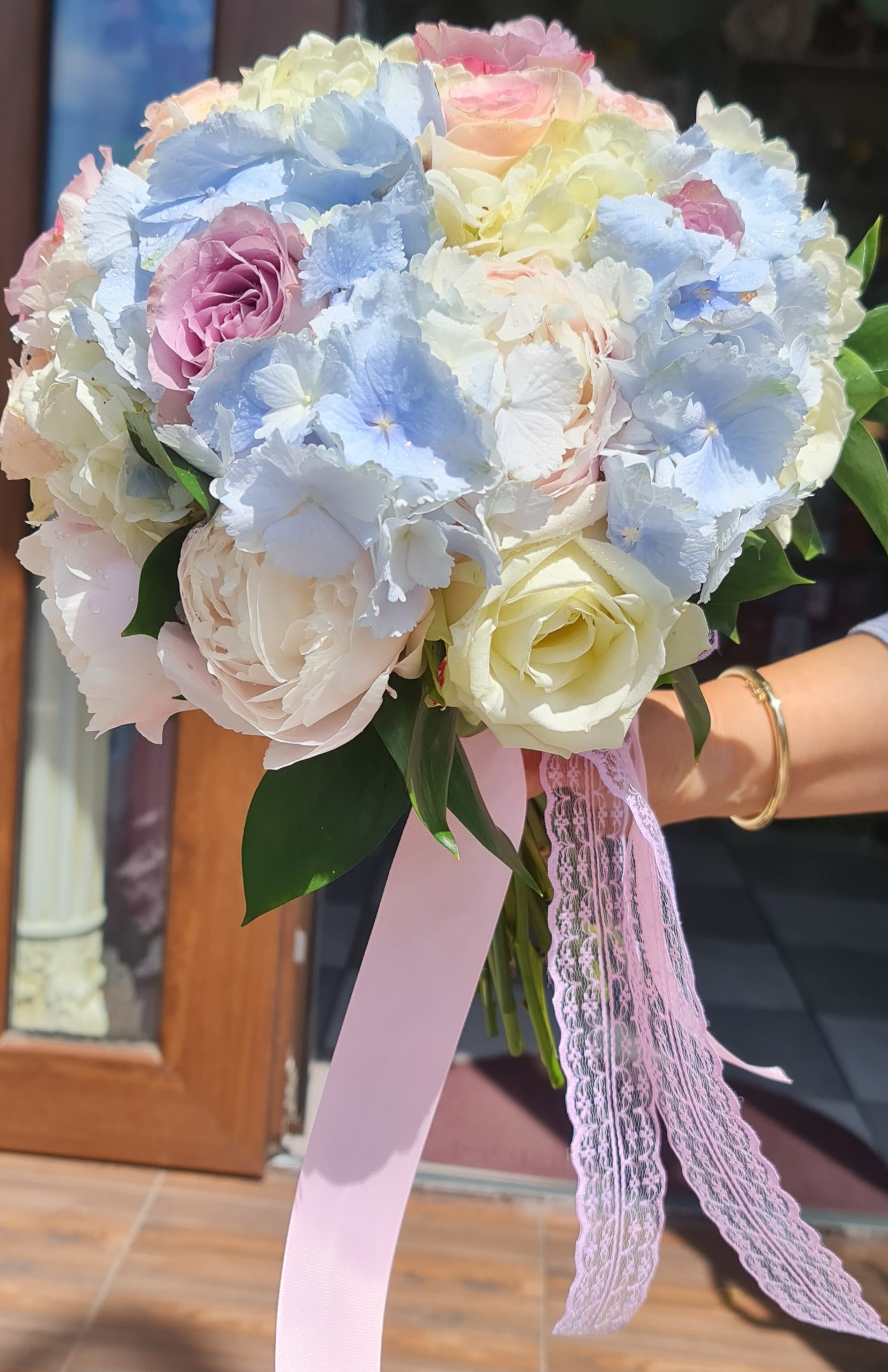Buchet de nuntă realizat din hortensie, bujori și trandafiri, atent alese și aranjate într-o paletă delicată de alb, roz și bleu. Combinația florală oferă volum, finețe și un aer romantic, fiind perfectă pentru o mireasă care își dorește un buchet elegant, luminos și plin de rafinament.